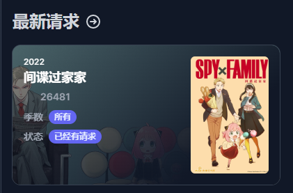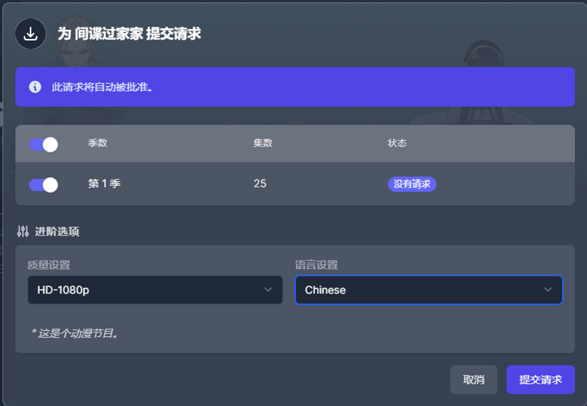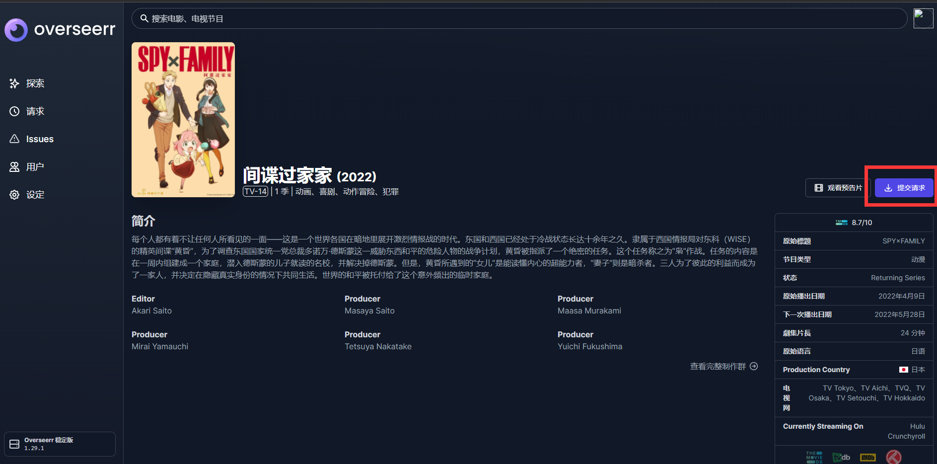 1、打开overseerr,选择一部新番,如最新很火的间谍过家家,可以看到剧集的详细信息,然后点击提交请求