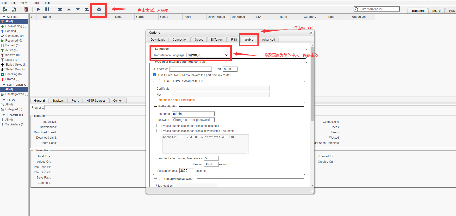 linuxserver/qbittorrent:latest3、浏览器输入http://localhost:8080,打开qbittorrent界面