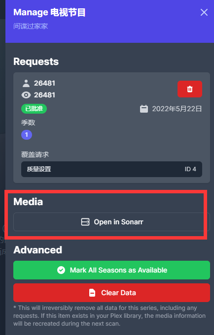 3、可以在主界面看到最新的请求,点击状态可以在media中通过Open in Sonarr直接跳转