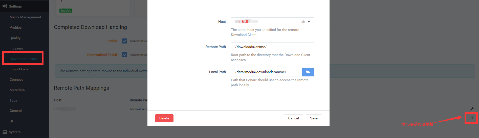 - 在添加下载器时,点击边上的加号配置硬链接源地址,源地址是下载器中的视频地址,本地地址是相对应sonarr的地址,可以通过点击右侧文件夹图标自行查找