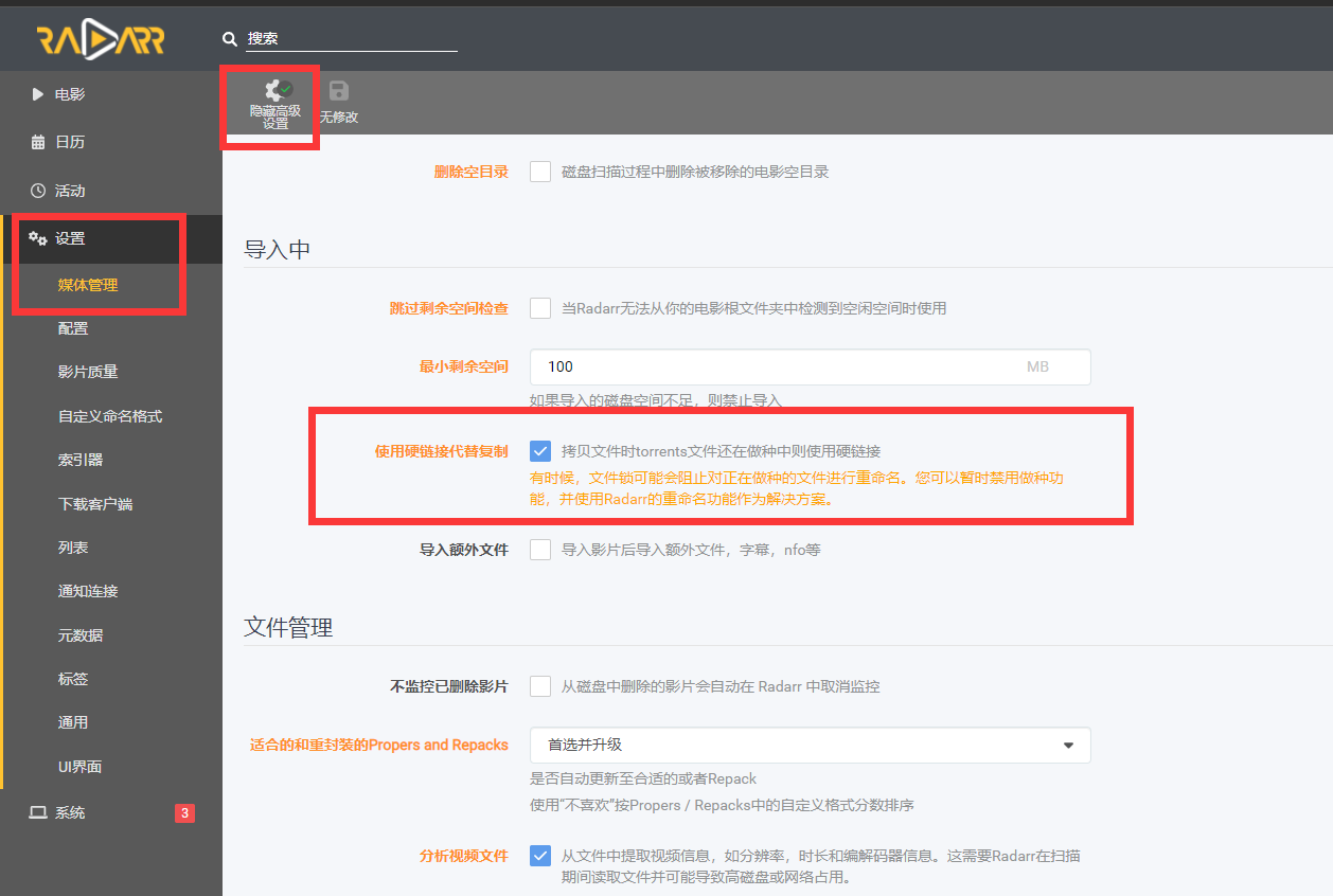 - 进入设置—>媒体管理,点击显示高级设置,开启硬链接并添加电影根目录