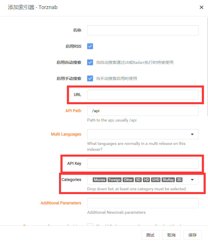 URL和API可以在Jackett上面获取,Categories也可以根据jackett里面的对应值选择