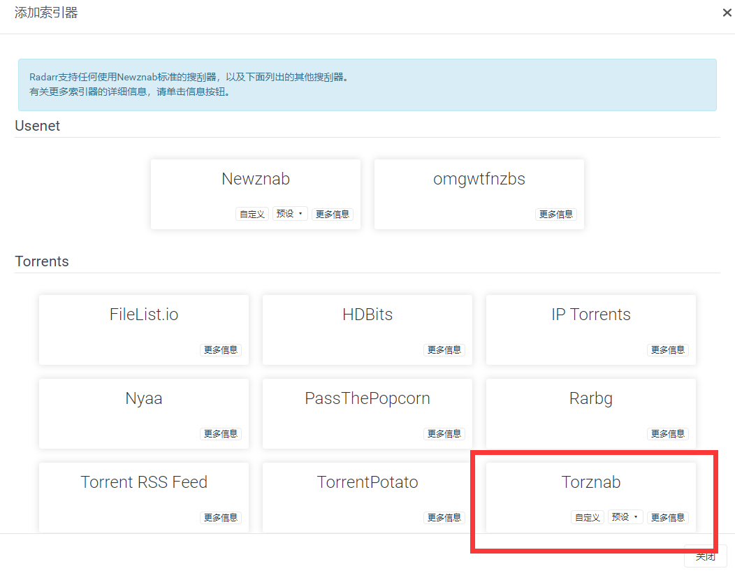 配置下载器和检索器Indexer,Radarr只能用于检索电影,不过有中文。