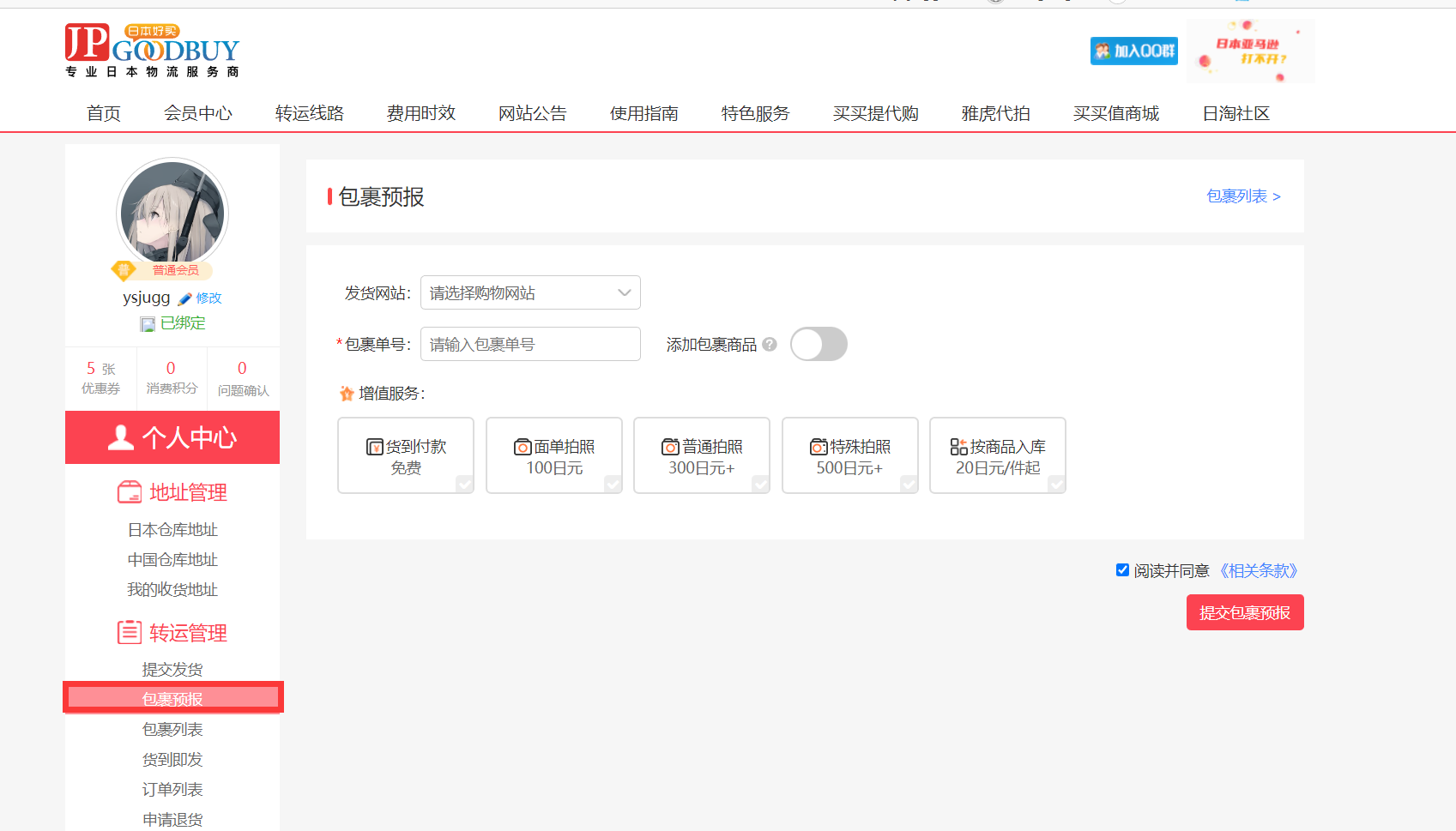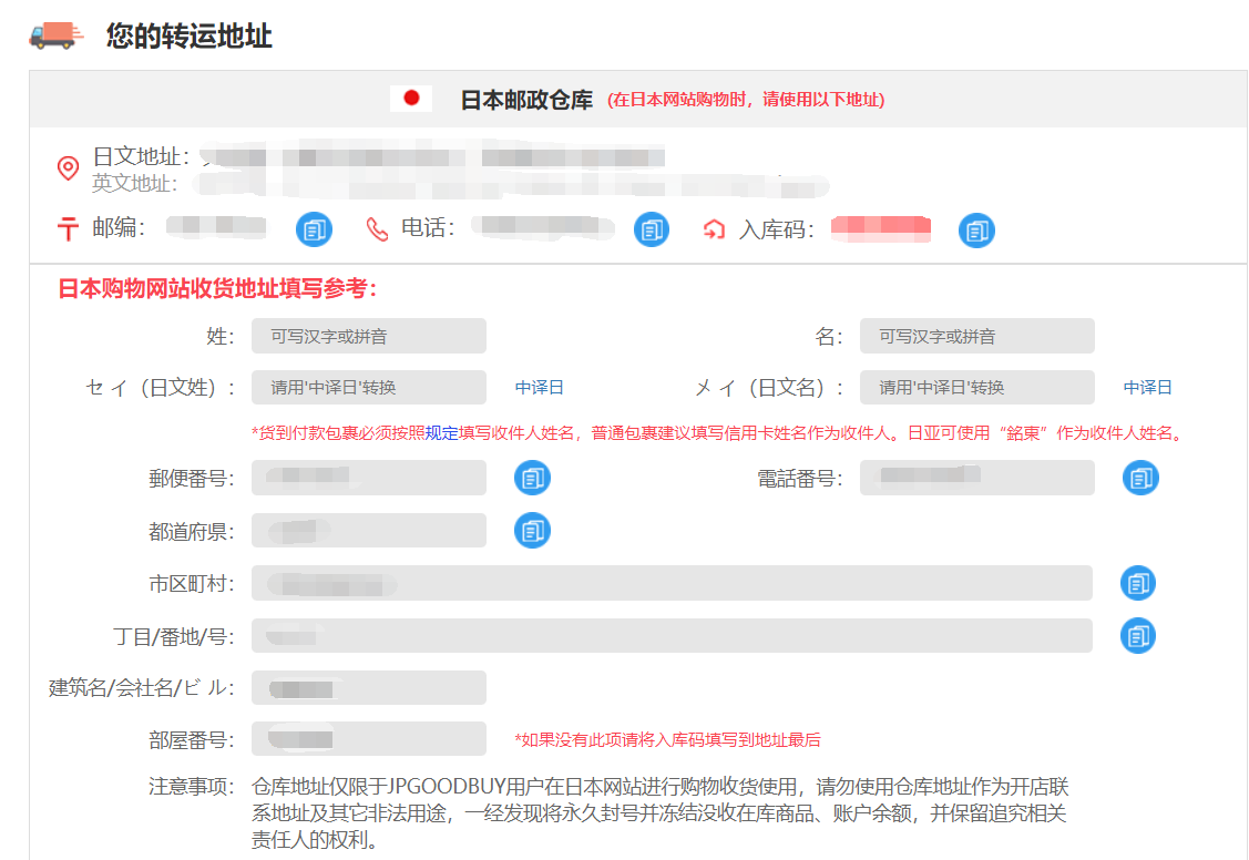 注册完成进入个人页面后,就可以获取后续购物最关键的信息,日本的转运地址。