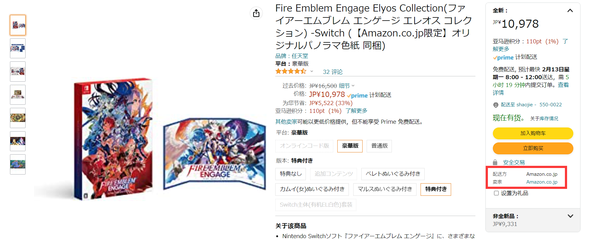 在这次海淘中,主要是为了购买火焰纹章engage,在对比了任天堂官方商店和日亚后,我果断选择了日亚,因为同样购买豪华版,官方原价是JP¥10,978,而日亚有14%的优惠,只需要JP¥9,473,如果使用原价JP¥10,978购买,则可以获得日亚限定,一个色纸。稍微犹豫了一会,秉着都花了那么多钱买限定版了,也不差这点,于是我预订了带日亚限定的版本。
