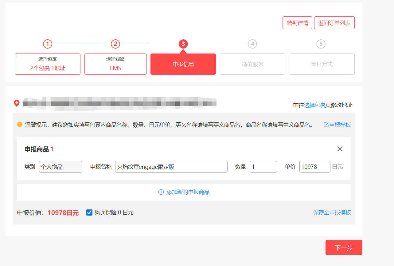 选择完线路后就是填写申报信息,我这边是完全按照亚马逊的订单信息填写,如果害怕被税太多,可以适当少报点钱