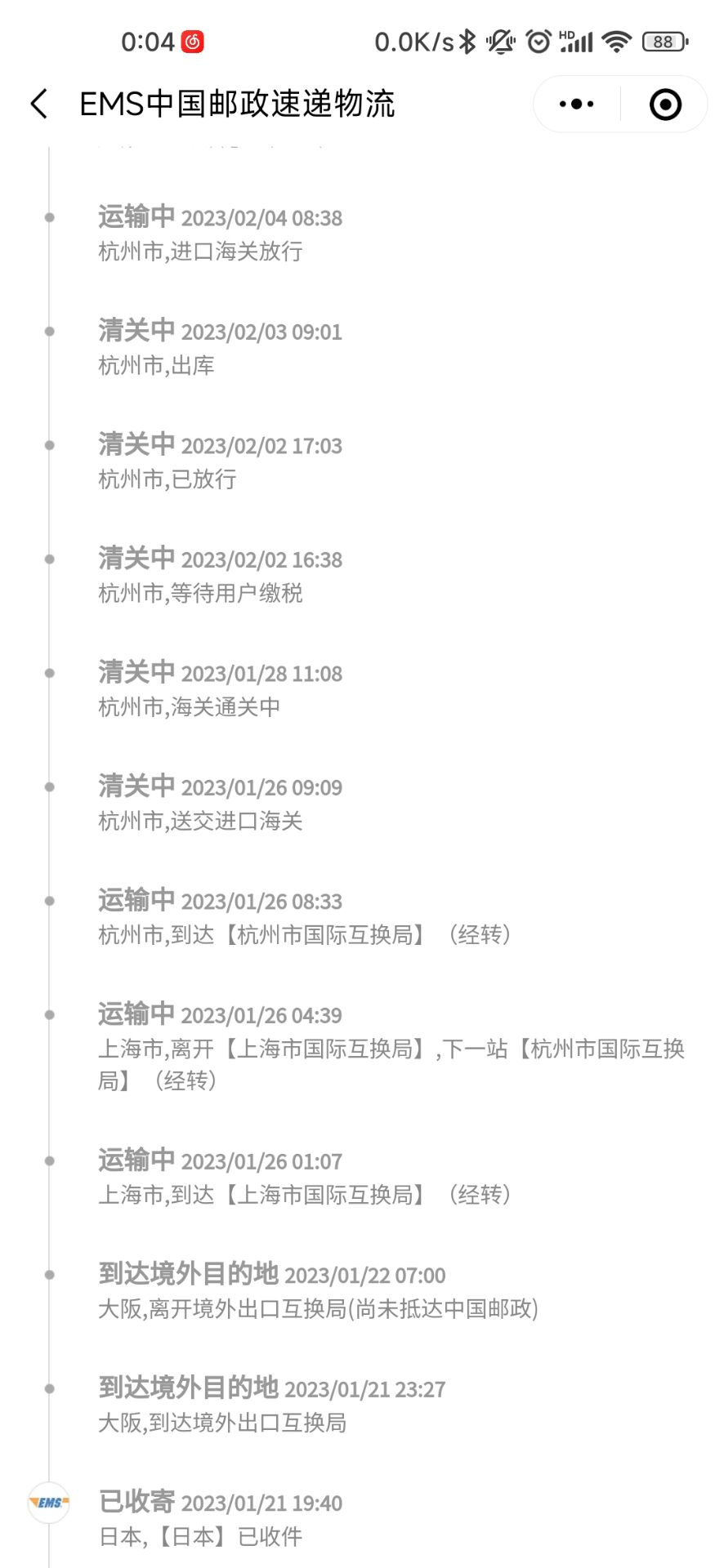 EMS快递从日本发出后,共花费4天不到的时间到达国内,然后会运到收获地址所在地区的海关进行清关。由于我的快递到杭州海关的那段时候,还在春节期间,所以物流特别特别慢,连着很多天都没什么动静,这个时候需要及时联系EMS的客服,让客服帮你去催。催过以后第二天海关就电话联系我准备排队清关准备交税了,交过税很快海关放行就算是完成了清关,后面的快递就很快了。